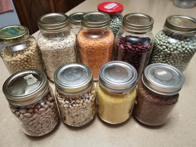 由于豆类部分可以替代肉类,是补充人体需要蛋白质、脂肪、膳食纤维、维生素、微量元素等营养物质的优良食材,加上存放时间长,可以适当多储存些。面粉可以做成压缩饼干,也可以增加保存时间。总之,家庭存粮要干燥、密闭结实的容器(不易有虫)和低温、避光、干燥的环境。